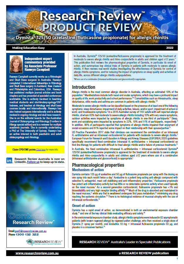 This review discusses pharmacological properties, mechanism of action and major studies featuring azelastine/fluticasone propionate. It also provides commentary and recommendations from Associate Professor Raewyn Campbell, a Rhinologist and Skull Base surgeon in Australia.