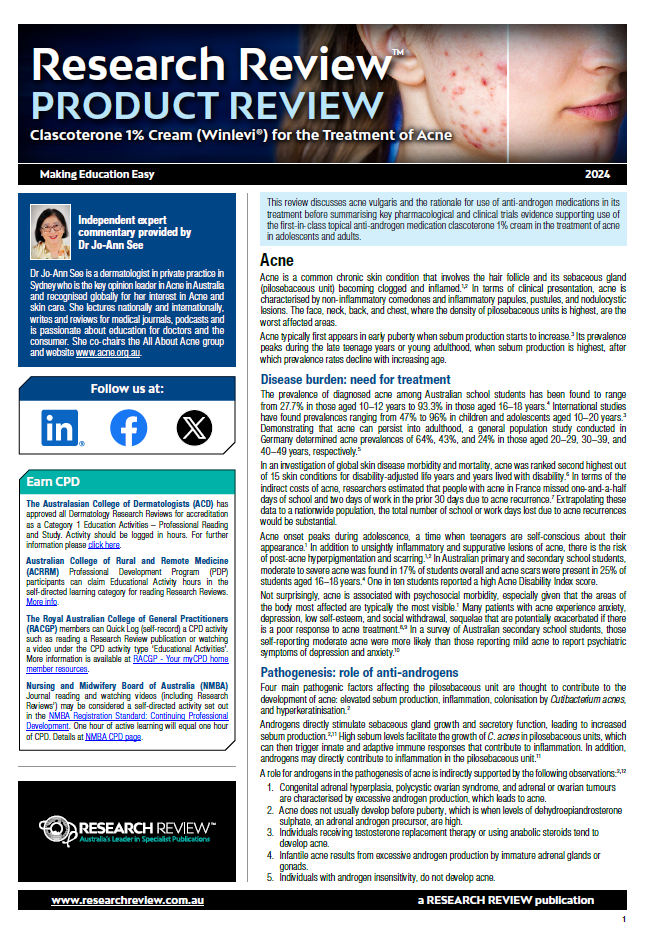 This publication discusses acne vulgaris and the use of anti-androgen medications in its treatment and key clinical trials supporting use of clascoterone cream in the treatment of acne. It provides commentary from Dr Jo-Ann See, a dermatologist in private practice in Sydney.