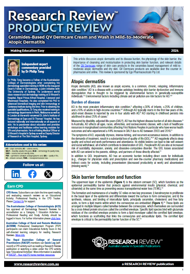 This review discusses burden of disease, skin barrier dysfunction in atopic dermatitis, management of atopic dermatitis, key published studies and product attributes. It provides commentary from Dr Philip Tong a Visiting Medical Officer at St Vincent’s Hospital and Deputy Director of Research at The Skin Hospital, Sydney.