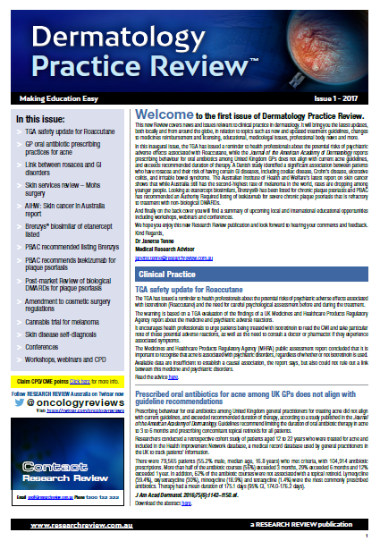 This Review features key medical articles from global Dermatology journals with commentary from Dr Warren Weightman The Review covers topics such as psoriasis, acne, vitiligo, rosacea and dermatitis.