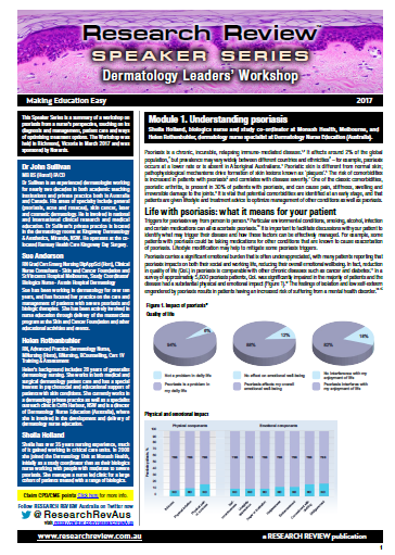This review is a summary of presentations delivered by Dr John Sullivan (Dermatologist at Kingsway Dermatology & Aesthetics, Miranda, NSW); Sue Anderson (Clinical Nurse Consultant - Skin and Cancer Foundation and St Vincents Hospital Melbourne, Study Coordinator/Biologics Nurse - Austin Hospital Dermatology); Helen Rothenbuhler (Advanced Practice Dermatology Nurse and a director of Dermatology Nurse Education, Australia) and Sheila Holland from the Dermatology Unit at Monash Health.