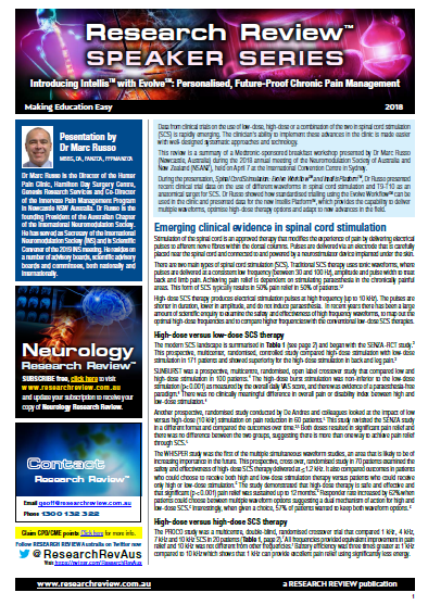 The review covers the emerging evidence for spinal cord stimulation and the use of different waveforms, together with high and low dose comparisons. Dr Russo is the Director of the Hunter Pain Clinic, Hamilton Day Surgery Centre, Genesis Research Services and Co-Director of the Innervate Pain Management Program in Newcastle NSW Australia. Dr Russo is the founding President of the Australian Chapter of the International Neuromodulation Society.