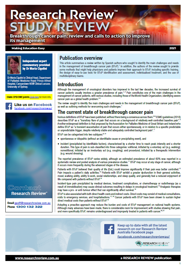 As part of our ongoing aim to bring you reports of interesting new studies, we have added a review of a Spanish study identifying the main challenges and needs in the management of breakthrough cancer pain.