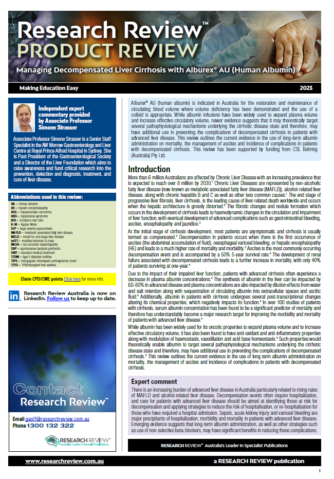 As part of our series focussing on available medicines in Australia, we have added a product review of use of human albumin in managing decompensated liver cirrhosis.
