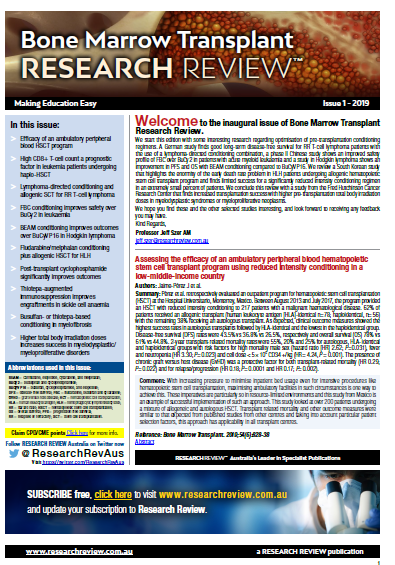 Dr David Routledge. The review covers topics such as assessing transplant programs, preconditioning, lymphoma and leukaemia treatment, sickle cell anaemia, myelofibrosis, and graft rejection.