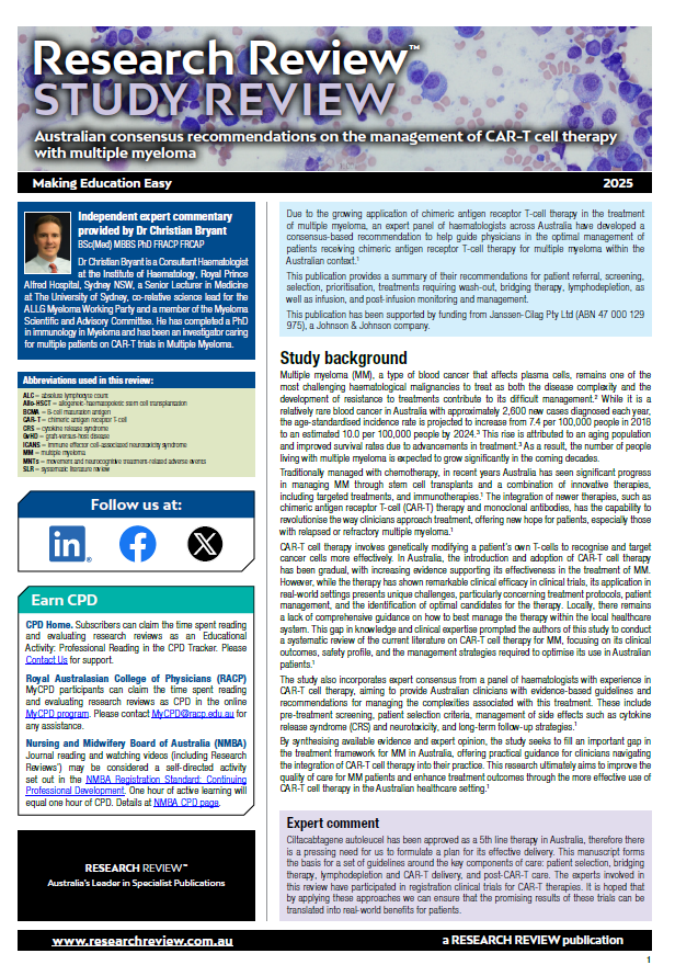 Independent commentary for the review has been provided by Dr Christian Bryant, a Consultant Haematologist at the Institute of Haematology, Royal Prince Alfred Hospital, Sydney NSW, a Senior Lecturer in Medicine at The University of Sydney, co-relative science lead for the ALLG Myeloma Working Party and a member of the Myeloma Scientific and Advisory Committee.