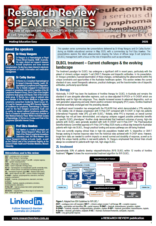 This review summarises two presentations delivered by Dr Vinay Vanguru and Dr Cathy Burton during an AbbVie educational seminar in May 2025, with commentary by Prof Eliza Hawkes. The presentations explore the latest advancements shaping the future of diffuse large B-cell lymphoma management, with a focus on the role of bispecifics.