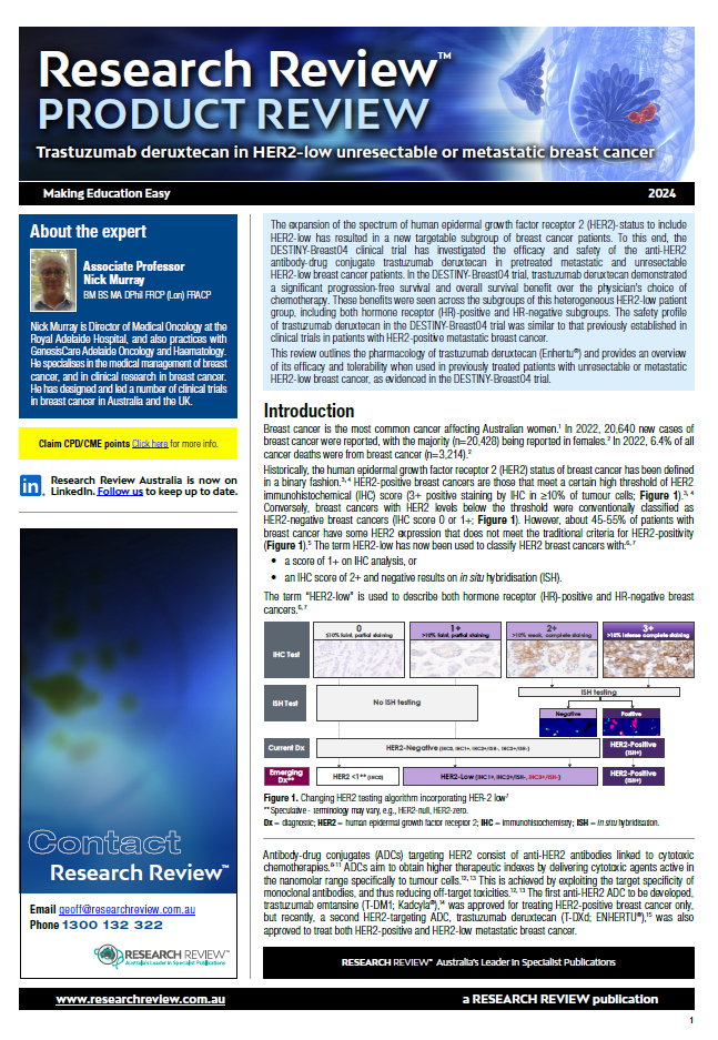As part of our series focussing on medicines in Australia, we have added a product review of the use of trastuzumab deruxtecan in HER2-low unresectable or metastatic breast cancer.