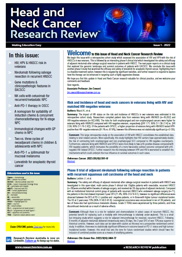 Drs Brian Stein and Marcin Dzienis. The Review covers topics such as head and neck cancer, squamous cell carcinoma, nasopharyngeal carcinoma, mucosal melanoma, and thyroid cancer.