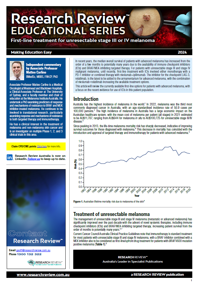 The review covers the currently available first-line options for patients with advanced melanoma, with a focus on the recent evidence for use of ICIs in this patient population. It also includes guiding commentary from Associate Professor Matteo Carlino, a Medical Oncologist at Westmead and Blacktown Hospitals, and Clinical Associate Professor at The University of Sydney.