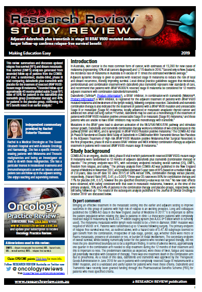 As part of our ongoing aim to bring you reports of interesting new studies, we have added a review of a recent study focused on patient-reported outcomes in resected, high-risk melanoma with BRAFV600E or BRAFV600K mutations treated with adjuvant dabrafenib plus trametinib.