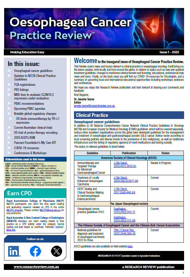 Associate Professor Stephanie Lim and Dr Annette Tognela, a senior medical oncologist and Director of the Macarthur Cancer Therapy Centre, Campbelltown. The Review covers topics such as gastroesophageal junction cancer, oesophageal squamous cell carcinoma, CAR-T cell therapy and many other oncology topics.