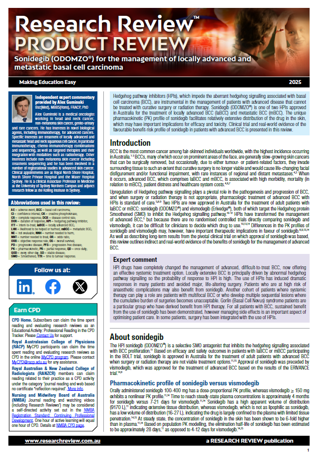 This review discusses indications and dosage, contraindications and a series of clinical studies featuring sonidegib. It provides commentary from Clinical Associate Professor Alex Guminski, a medical oncologist at Royal North Shore Hospital, and the Mater Hospital, Sydney.
