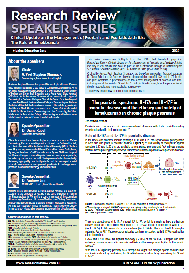 Chaired by Associate Professor Stephen Shumack at the recent ACD meeting, the symposium featured speakers Dr Diana Rubel and Dr Andrew Lim who discussed the role of IL-17A and IL-17F in skin and joint symptoms in presentations on the current management of psoriasis and PsA.