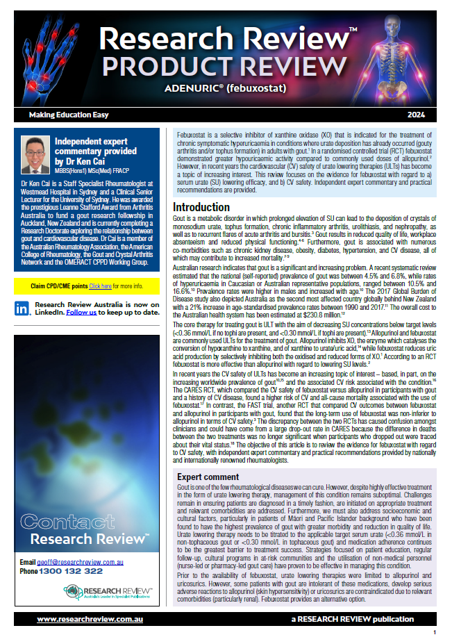 This publication focuses on the efficacy and safety of febuxostat and provides commentary from Dr Ken Cai, a Staff Specialist Rheumatologist at Westmead Hospital in Sydney and Clinical Senior Lecturer for the University of Sydney.