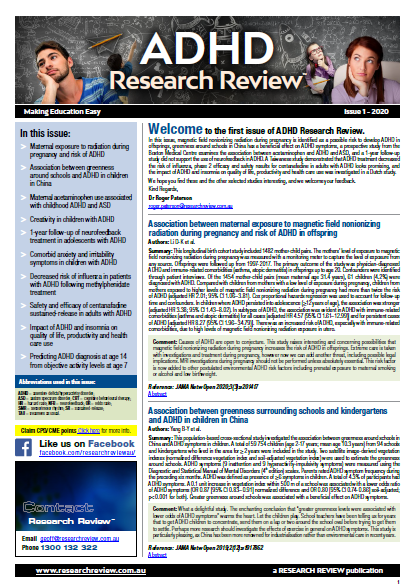 This Review features key medical articles from global psychiatry journals with commentary from Dr Terrance Lim. The Review covers topics such as anxiety and irritability in ADHD, impact of ADHD and insomnia on quality of life and productivity, risk factors, new medicines and neurofeedback treatment.