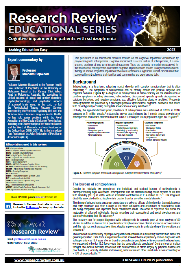 The review covers the background and burden of schizophrenia, schizophrenia and cognitive function, current management and treatments for cognitive impairment, and a focus on new glycine transporter-1 inhibitors. It also includes guiding commentary from Professor Malcolm Hopwood, Ramsay Health Care Professor of Psychiatry, at the University of Melbourne.