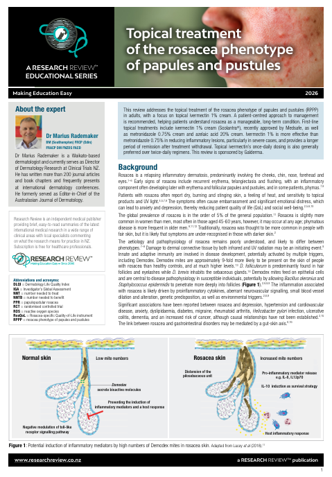 This review addresses the topical treatment of the rosacea phenotype of papules and pustules (RPPP) in adults, with a focus on topical ivermectin 1% cream. A patient-centred approach to management is recommended, helping patients understand rosacea as a manageable, long-term condition. First-line topical treatments include ivermectin 1% cream (Soolantra®), recently approved by Medsafe, as well as metronidazole 0.75% cream and azelaic acid 20% cream. Ivermectin 1% is more effective than metronidazole 0.75% in reducing inflammatory lesions, particularly in severe cases, and provides a longer period of remission after treatment withdrawal. Topical ivermectin’s once-daily dosing is also generally preferred over twice-daily regimens.