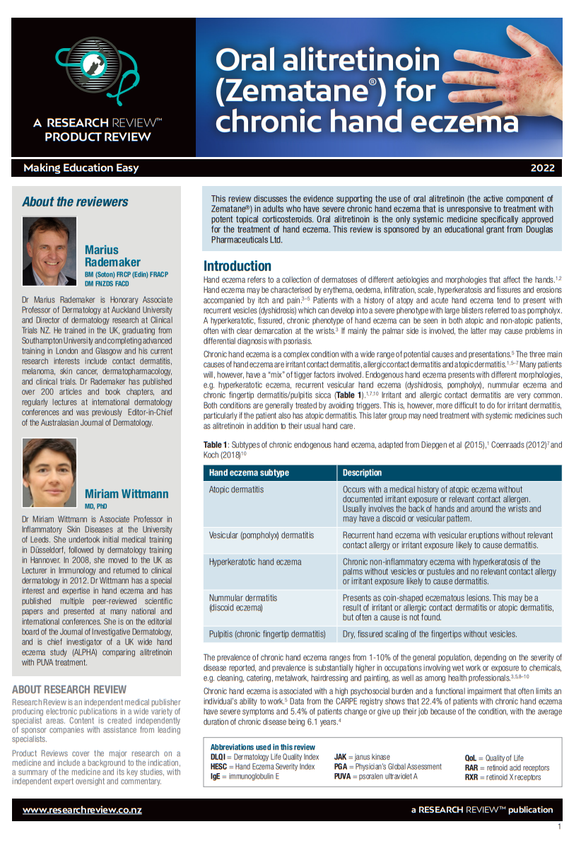 This review discusses the evidence supporting the use of oral alitretinoin (the active component of Zematane®) in adults who have severe chronic hand eczema that is unresponsive to treatment with potent topical corticosteroids. Oral alitretinoin is the only systemic medicine specifically approved for the treatment of hand eczema. This review is sponsored by an educational grant from Douglas Pharmaceuticals Ltd.