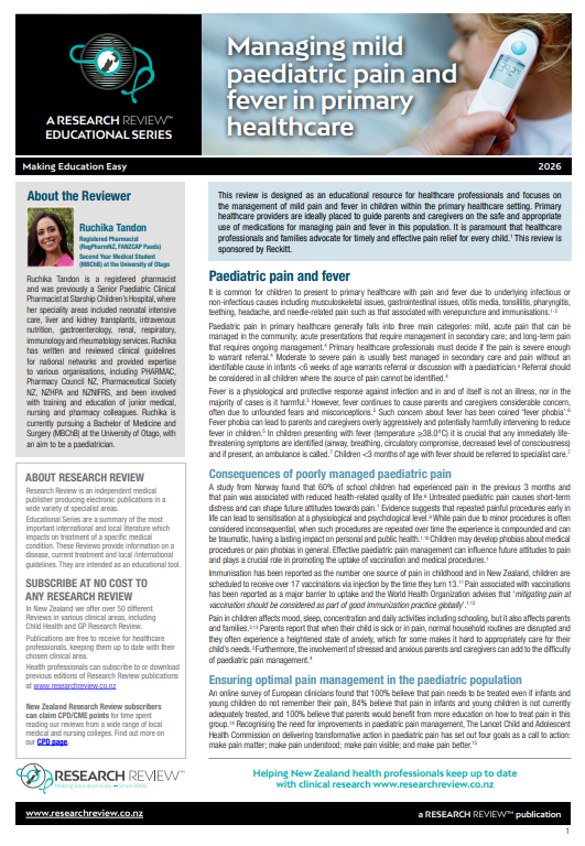 This review is designed as an educational resource for healthcare professionals and focuses on the management of mild pain and fever in children within the primary healthcare setting. Primary healthcare providers are ideally placed to guide parents and caregivers on the safe and appropriate use of medications for managing pain and fever in this population. It is paramount that healthcare professionals and families advocate for timely and effective pain relief for every child.
