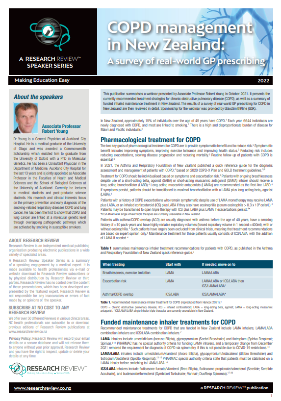 This publication summarises a webinar presented by Associate Professor Robert Young in October 2021. It presents the currently recommended treatment strategies for chronic obstructive pulmonary disease (COPD), as well as a summary of funded inhaled maintenance treatment in New Zealand. The results of a survey of real-world GP prescribing for COPD in New Zealand are then reviewed in detail. Sponsorship for the webinar was provided by GlaxoSmithKline (GSK).