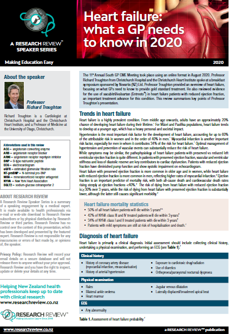 The 11th Annual South GP CME Meeting took place using an online format in August 2020. Professor Richard Troughton from Christchurch Hospital and the Christchurch Heart Institute spoke at a breakfast symposium sponsored by Novartis (NZ) Ltd. Professor Troughton provided an overview of heart failure, focusing on what GPs need to know to provide gold standard treatment. He also reviewed evidence for the use of sacubitril/valsartan (Entresto®) in heart failure patients with reduced ejection fraction, an important treatment advance for this condition. This review summarises key points of Professor Troughton’s presentation.
