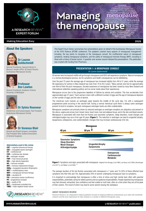 This Expert Forum Series summarises four presentations given on behalf of the Australasian Menopause Society at the 2025 Rotorua GPCME conference. The speakers covered many aspects of menopausal management including, the key points to recognise at the menopause consult, the multifactorial nature of menopausal symptoms, treating menopausal symptoms, and the safety of menopausal hormone therapy (MHT), including in those with a history of breast cancer. A question-and-answer session followed the presentations.