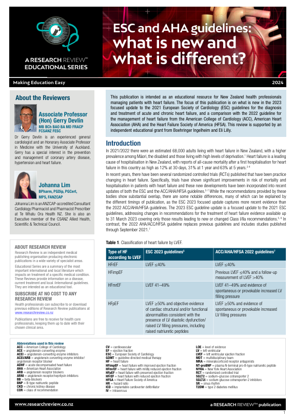 This publication is intended as an educational resource for New Zealand health professionals managing patients with heart failure. The focus of this publication is on what is new in the 2023 focused update to the 2021 European Society of Cardiology (ESC) guidelines for the diagnosis and treatment of acute and chronic heart failure, and a comparison with the 2022 guideline for the management of heart failure from the American College of Cardiology (ACC), American Heart Association (AHA) and the Heart Failure Society of America (HFSA). This review is supported by an independent educational grant from Boehringer Ingelheim and Eli Lilly.