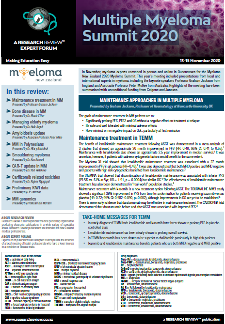 In November, myeloma experts convened in person and online in Queenstown for the Myeloma New Zealand 2020 Myeloma Summit. This year’s meeting included presentations from local and international experts in myeloma, including the keynote speakers Professor Graham Jackson from England and Associate Professor Peter Mollee from Australia. Highlights of the meeting have been summarised with unconditional funding from Celgene and Janssen.