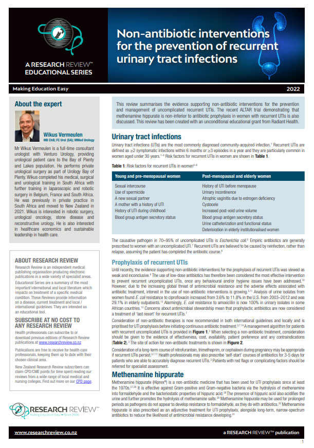 This review summarises the evidence supporting non-antibiotic interventions for the prevention and management of uncomplicated recurrent UTIs. The recent ALTAR trial demonstrating that methenamine hippurate is non-inferior to antibiotic prophylaxis in women with recurrent UTIs is also discussed. This review has been created with an unconditional educational grant from Radiant Health.