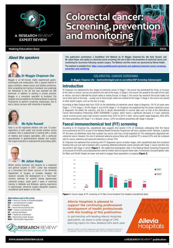 This publication summarises a Goodfellow Unit Webinar by Dr Maggie Chapman-Ow, Ms Kylie Russell, and Mr Julian Hayes, who spoke on colorectal cancer screening, the role of diet in the prevention of colorectal cancer, and monitoring for recurrence following curative surgery. The Webinar and this review are sponsored by Allevia Health. The webinar is available from: https://www.goodfellowunit.org/events-and-webinars/colorectal-cancer-screening prevention-and-monitoring