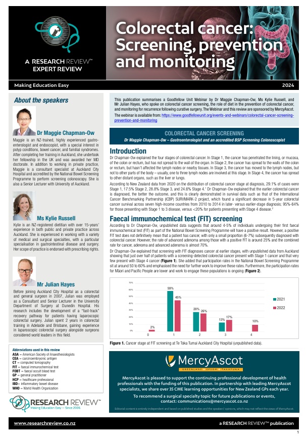 This publication summarises a Goodfellow Unit Webinar by Dr Maggie Chapman-Ow, Ms Kylie Russell, and Mr Julian Hayes, who spoke on colorectal cancer screening, the role of diet in the prevention of colorectal cancer, and monitoring for recurrence following curative surgery. The Webinar and this review are sponsored by MercyAscot. The webinar is available from: https://www.goodfellowunit.org/events-and-webinars/colorectal-cancer-screening prevention-and-monitoring