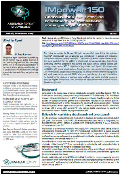 This review summarises the IMpower150 study, an open-label, phase III trial that evaluated Tecentriq® (atezolizumab) plus bevacizumab plus chemotherapy in patients with metastatic nonsquamous non-small-cell lung cancer (NSCLC) who had not previously received chemotherapy.1 The study concluded that the addition of atezolizumab to bevacizumab plus chemotherapy significantly improved progression-free survival and overall survival among patients with metastatic nonsquamous NSCLC, regardless of programmed death ligand-1 (PD-L1) expression and EGFR or ALK genetic alteration status.