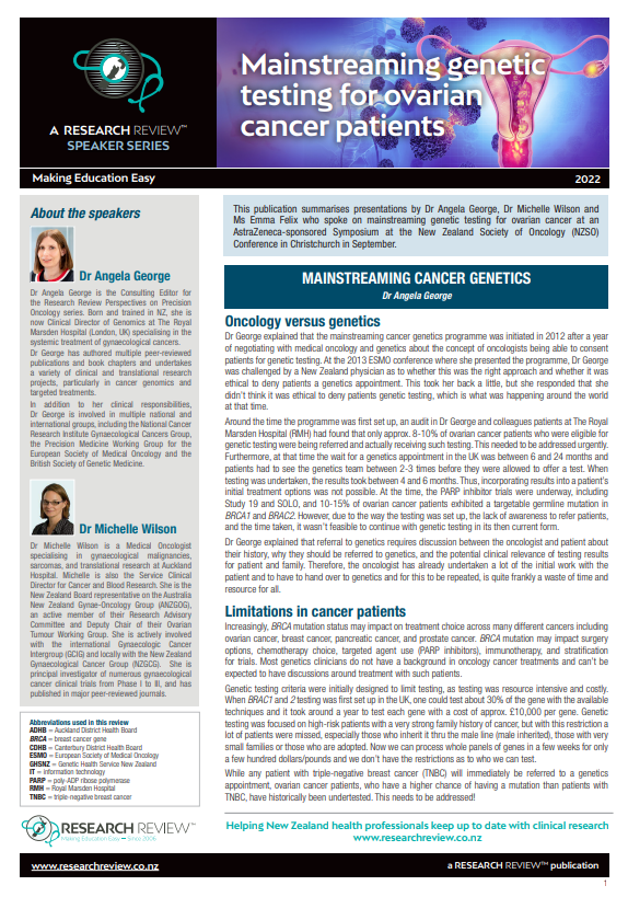 This publication summarises presentations by Dr Angela George, Dr Michelle Wilson and Ms Emma Felix who spoke on mainstreaming genetic testing for ovarian cancer at an AstraZeneca-sponsored Symposium at the New Zealand Society of Oncology (NZSO) Conference in Christchurch in September.