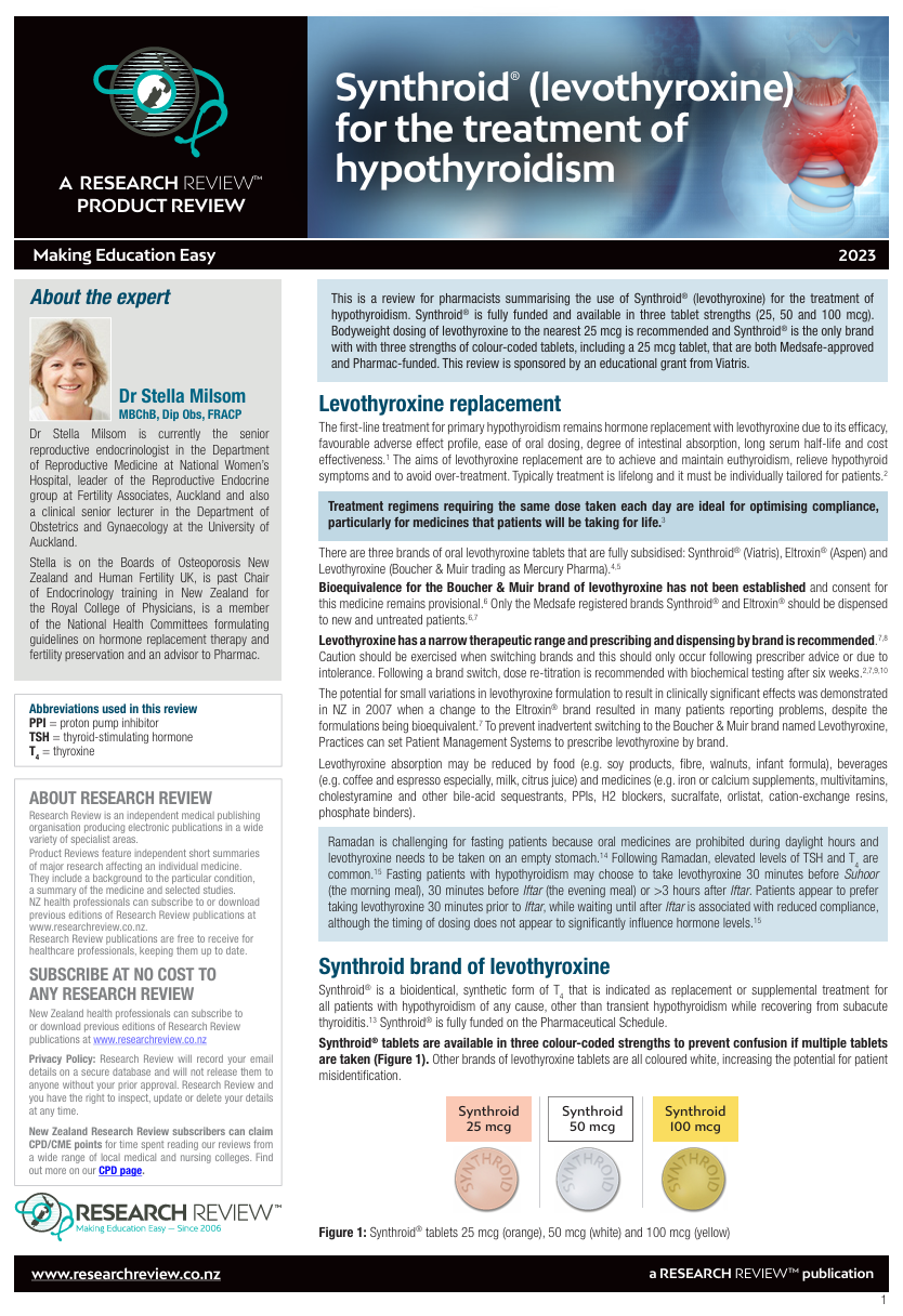 This is a review for pharmacists summarising the use of Synthroid® (levothyroxine) for the treatment of hypothyroidism. Synthroid® is fully funded and available in three tablet strengths (25, 50 and 100 mcg). Bodyweight dosing of levothyroxine to the nearest 25 mcg is recommended and Synthroid® is the only brand with with three strengths of colour-coded tablets, including a 25 mcg tablet, that are both Medsafe-approved and Pharmac-funded. This review is sponsored by an educational grant from Viatris.