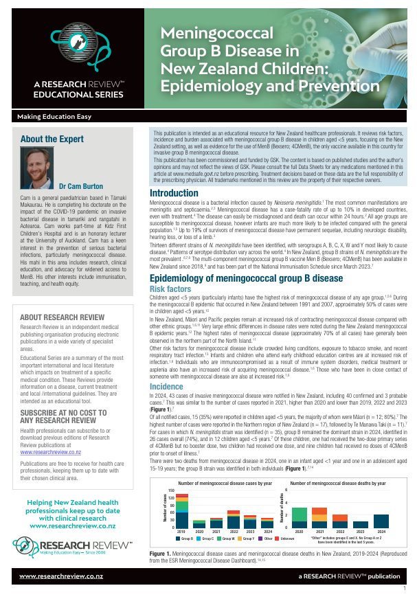 This publication is intended as an educational resource for New Zealand healthcare professionals. It reviews risk factors, incidence and burden associated with meningococcal group B disease in children aged <5 years, focusing on the New Zealand setting, as well as evidence for the use of MenB (Bexsero; 4CMenB), the only vaccine available in this country for invasive group B meningococcal disease.
